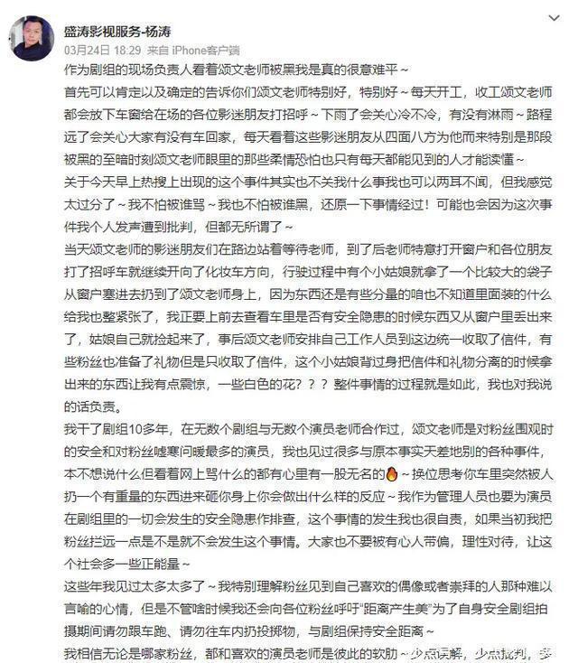 3月25日,据北青娱见消息,当这个话题如同火箭般冲上热搜之后,《谷雨》剧组拍摄现场负责人@盛涛影视服务 - 杨涛站了出来,发布微博澄清现场的情况。他的描述就像是在还原一幅生动的画面。他表示,当天“颂文老师特意打开窗户和各位朋友打了招呼车就继续开向了化妆车方向,行驶过程中有个小姑娘就拿了一个比较大的袋子从窗户塞进去扔到了颂文老师身上,因为东西还是有些分量的咱也不知道里面装的什么给我也整紧张了”。从他的话语中,我们仿佛能看到当时的场景,那突然飞进车内的袋子,让现场的人都不禁心头一紧。他正要上前去查看是否存在安全隐患的时候,东西从窗户里丢出来了。这一过程充满了悬念,这个袋子里到底装着什么呢?是单纯的信件,还是夹杂着其他让人意想不到的东西呢?