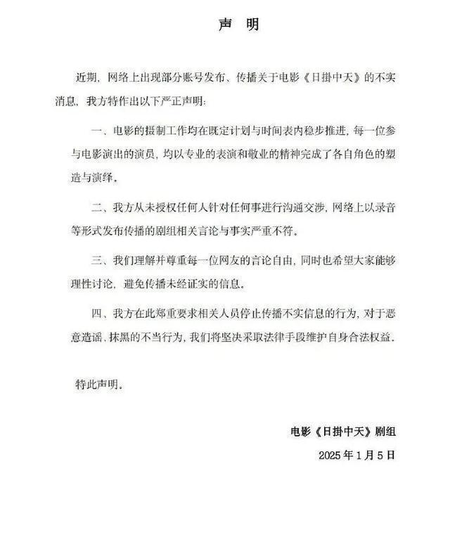 2025年1月5日,女演员姜尘晒与《日掛中天》投资人通话录音曝张颂文“家暴”,这一消息如同晴天霹雳,瞬间引发了广泛的关注。在娱乐圈这个大染缸里,“家暴”这样的丑闻一旦被曝光,无疑是对艺人形象的巨大打击。出事后,张颂文方面未作出回应。这种沉默是金的做法,在这个时候却让大众更加好奇事情的真相。5日晚,电影《日掛中天》官博发声明:我方从未授权任何人针对任何事进行沟通交涉,网络上以录音等形式发布传播的剧组相关言论与事实严重不符。这一声明又让整个事件变得更加扑朔迷离。是姜尘在说谎,还是背后有着不可告人的秘密呢?这一系列的疑问就像一团迷雾,笼罩在大众的心头。