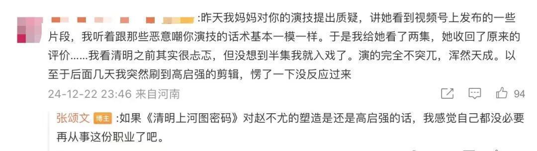 随后,张颂文在评论区回复网友留言,谈到了“新剧演技差”的话题。张颂文回复:“如果《清明上河图密码》对赵不尤的塑造还是高启强的话,我感觉自己都没必要再从事这份职业了吧。”他的这一回应充满了无奈与坚定,他渴望被认可,也希望能够用自己的演技去征服观众。而对于“攻击长相”的言论,张颂文则表示:“我没有办法改变父母给的长相,只能好好把每次工作做好,其它的,只能说一千个观众就有一千个哈姆雷特。”他的回应体现了一种豁达的态度。但舆论的风波并没有因为他的回应而平息,反而像是被风吹得更猛烈的火焰。